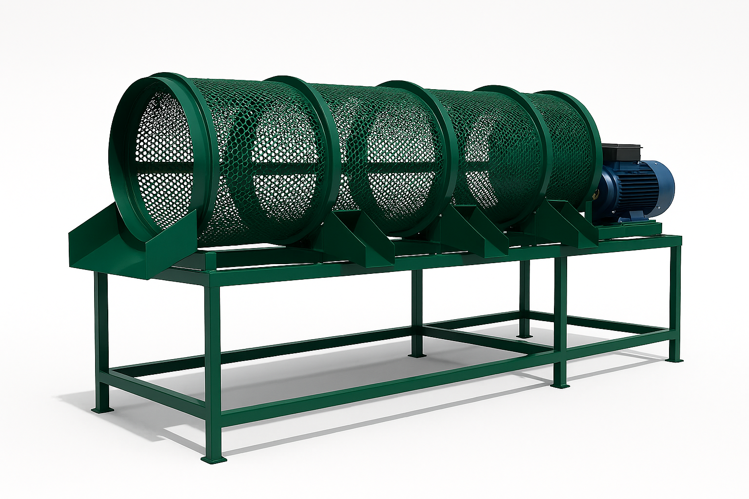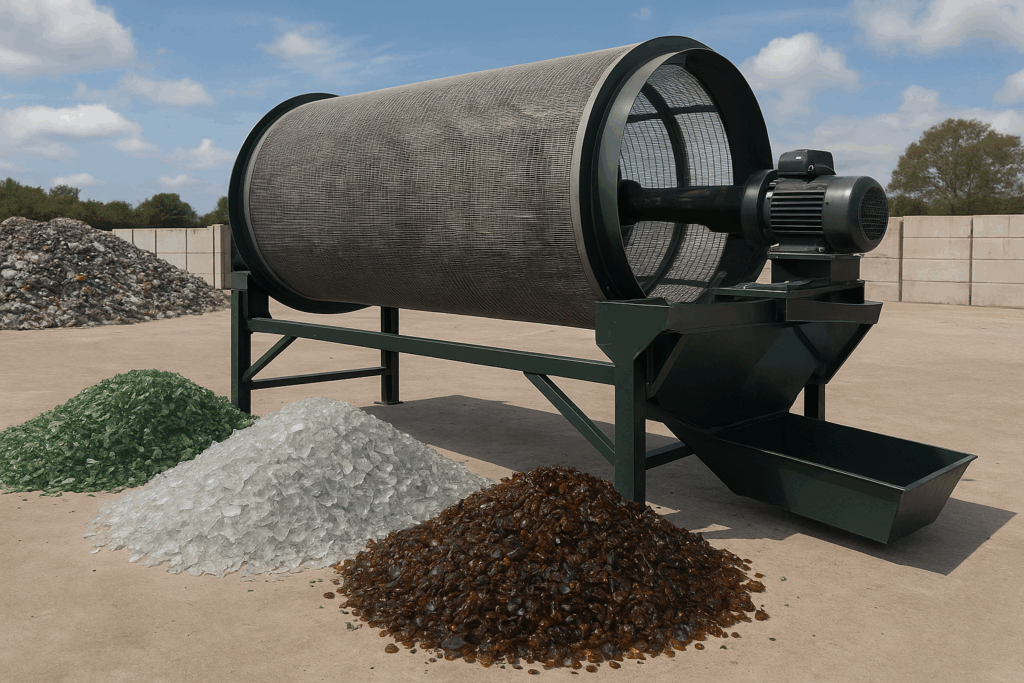 Rotating trommel for sorting crushed glass by size. Ideal for separating fine sand from larger cullet. Enhances recycling precision.